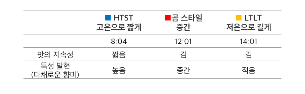 세 가지 로스팅 방식을 테스트 해 본 결과, 위와 같은 결과를 도출할 수 있었다. 커피볶는곰에서는 ‘특성을 잃지 않으면서 마시기 편한’ 커피를 추구하기 위해 HTST와 LTLT 방식의 중간 프로파일을 선택했지만 이는 정답이라고 볼 수는 없다. 젊은 층이 많이 모이는 대학가 등에서는 특성이 강하게 발현되는 HTST 방식이, 연령대가 높은 주택가 등에서는 편안하고 진한 맛의 LTLT가 더 선호도가 높을 것이라 예상되고, 어떤 커피를 선택하느냐에 따라서도 스타일을 다르게 갈 수 있는 것이다. 결국은 자신의 기준을 가지고 각자의 매장 컨셉 및 고객층에 맞게 로스팅 스타일을 조절하는 것이 중요하다 볼 수 있다.
