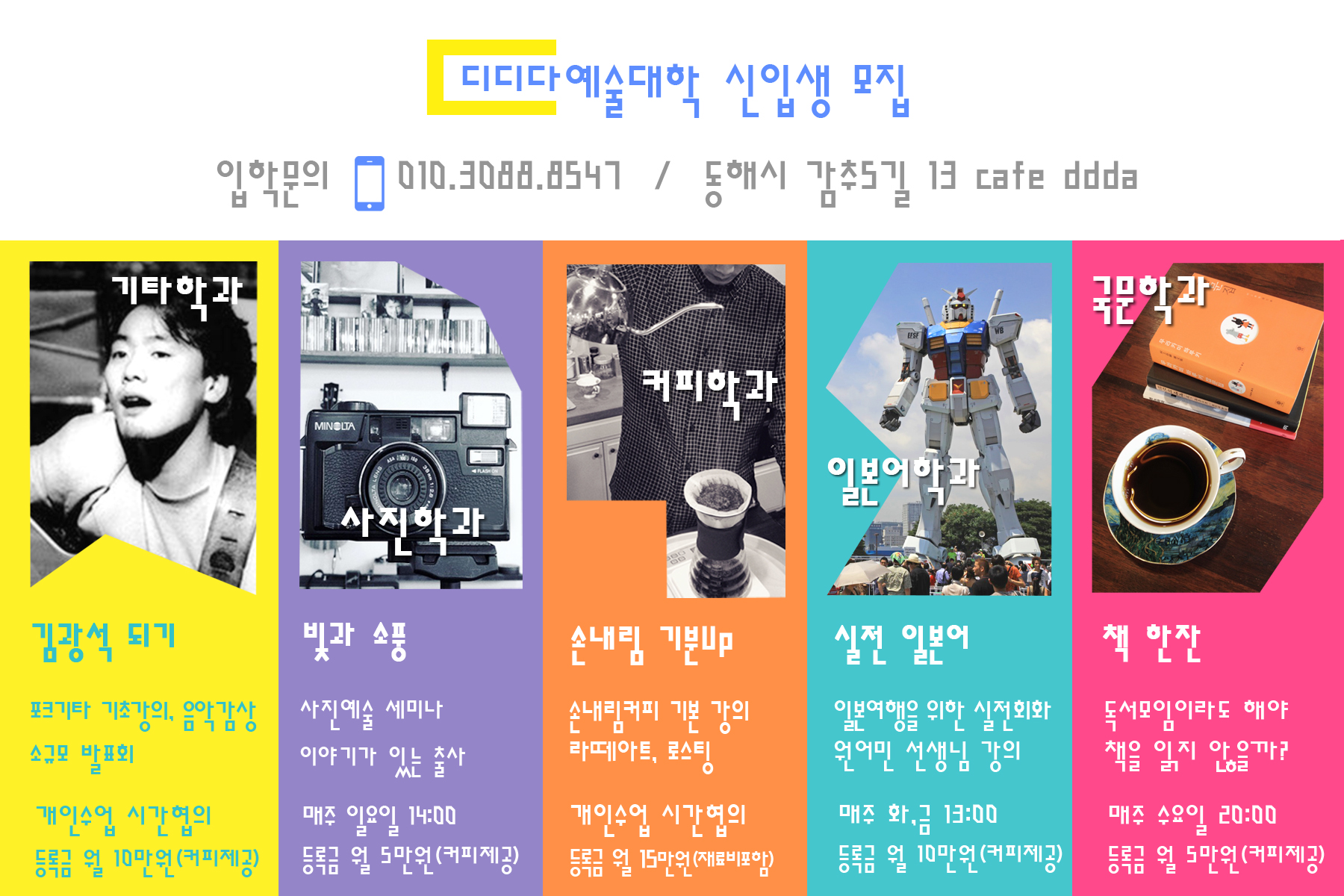 우리 주변에 음악, 사진, 커피, 책에 관심있는 분들은 많을 수 있어요, 그러나 대부분 그런 취미를 고독한 섬처럼 혼자 즐기고 계시진 않나요? 디디다예술대학은 취미를 공유하고 싶어 하는 단 한 분의 학생만 있어도 개설을 합니다.ㅎ