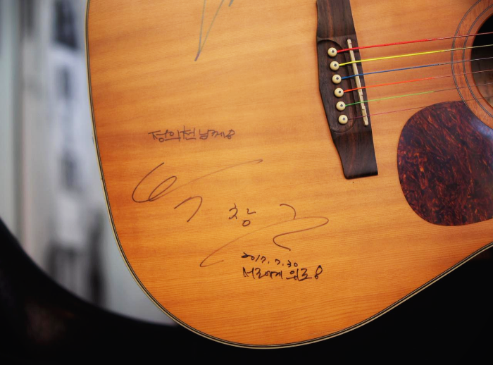 카페에 비치되어 있는 포크기타, 이 기타에는 몇몇 소중한 아티스트와의 추억이 담겨있다. 이제는 국민가수 하면 누구나 떠올리는 그 이름 박창근이다. 그런데 사실 국민가수 오디션 프로그램이 있기 전에는 카페에서 박창근의 사인을 본 손님들의 반응은...
